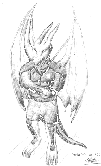 De'verge Sabrey is a half human Dragon. 6'8 tall, he wears a dented but sparkling armour plate over his torso his scales are a reflective emerald green. His fiery eyes give him excellent vision in both night and day and he has a great sense of smell but his hearing is lacking. De'verge Sabrey, or DarkSabre to his friends, rarely carries any weapons as his claws and teeth are more than deadly enough. Occasionally he does wield a sword. Apart from the alloy of the blade the sword is nothing fancy, a plain sword without decoration and a simple hilt.